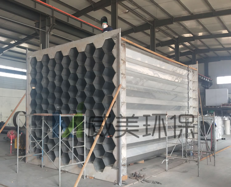 把多根陽(yáng)極管組合,形成蜂窩狀陽(yáng)極管束作為濕電除塵器沉淀電極。組裝并加強(qiáng)后,作為一個(gè)整體,與上下殼體連接,陽(yáng)極管制作嚴(yán)格按國(guó)家相關(guān)以及行業(yè)標(biāo)準(zhǔn)要求執(zhí)行,合格沉淀管內(nèi)表面應(yīng)平整順滑;