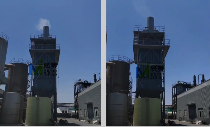 從焦亞硫酸鈉尾氣治理現場發來消息,濕電除霧器恒流源開機加檔后,效果非常顯著,下面是從現場傳來的圖片: